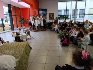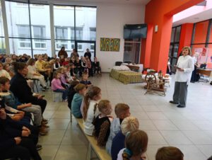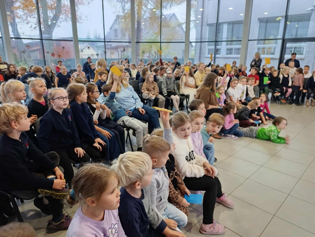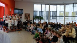 Paskutinę dieną prieš atostogas visi PUK, PUG ir pradinių klasių mokiniai susirinko į integruotą tikybos, visuomeninio ugdymo, muzikos pamoką. Pamoka buvo skirta apibendrinti, įtvirtinti, ką mokiniai sužinojo iš šiais mokslo metais mūsų gimnazijoje vykdomo ilgalaikio projekto „Blogį nugalėkime gerumu“, projekto pirmojo etapo. .